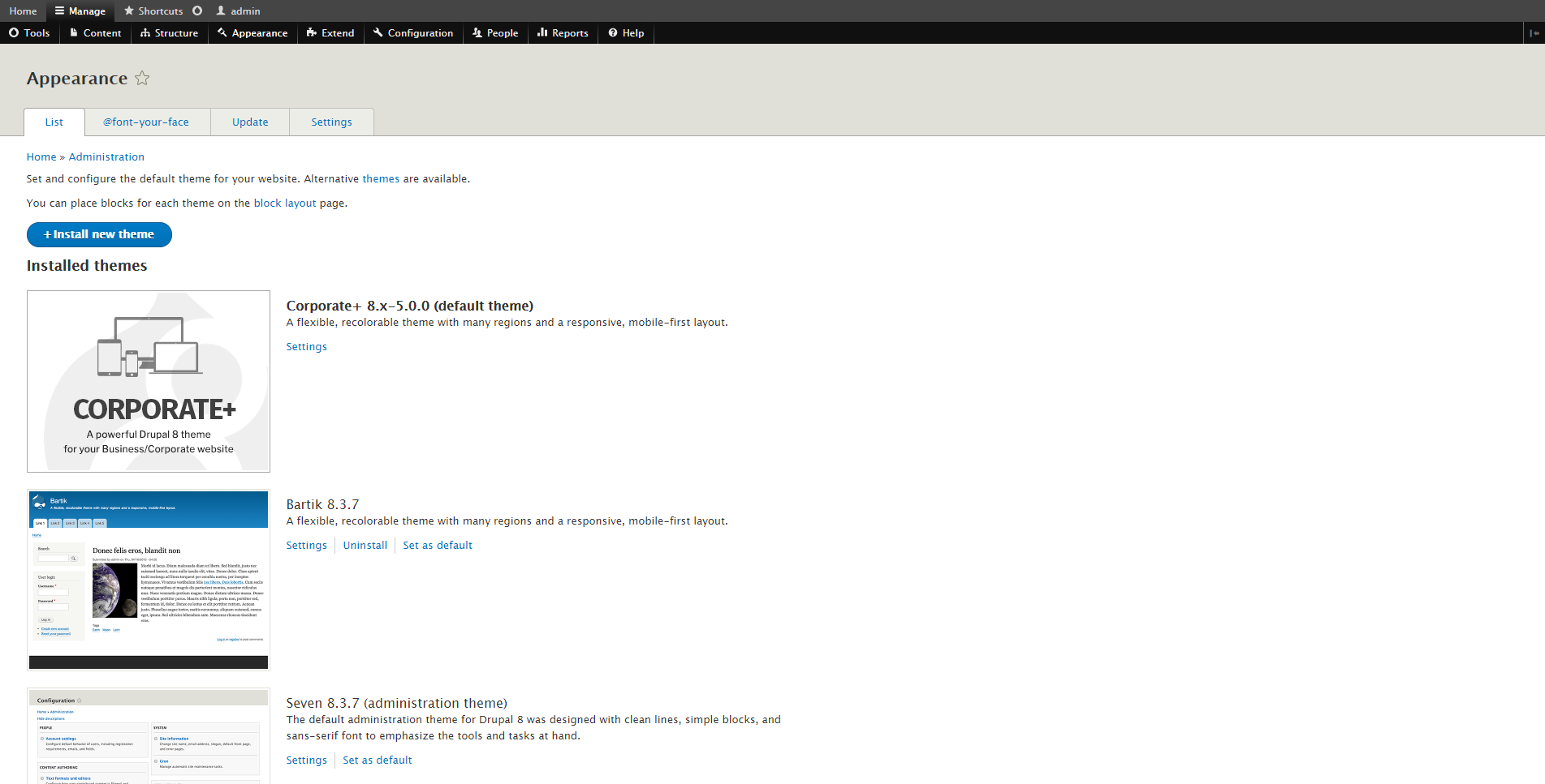 • Drupal 8 Admin Pages Appearance (Themes) Configuration Page