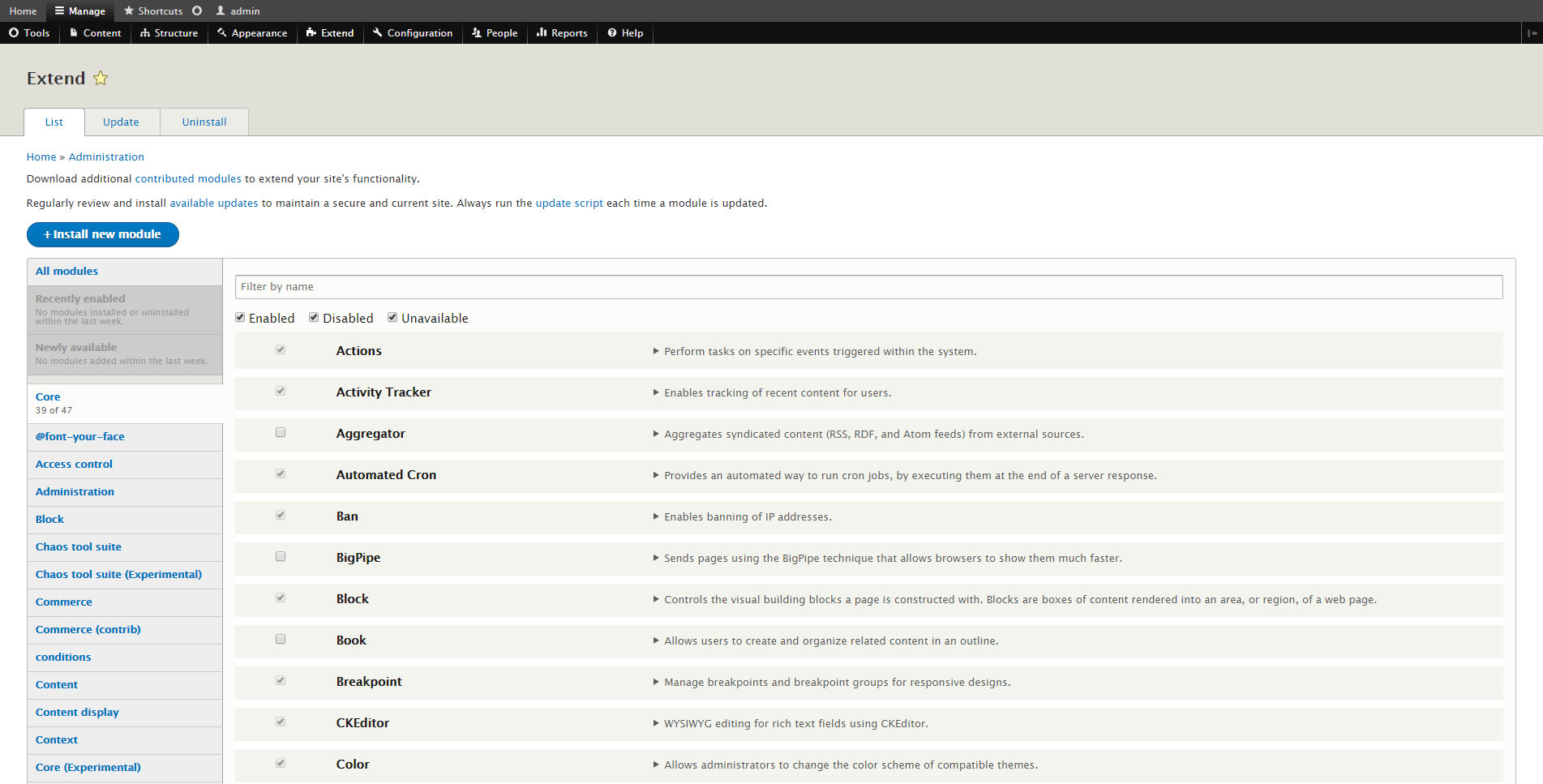 • Drupal 8 Admin Pages Module List Page