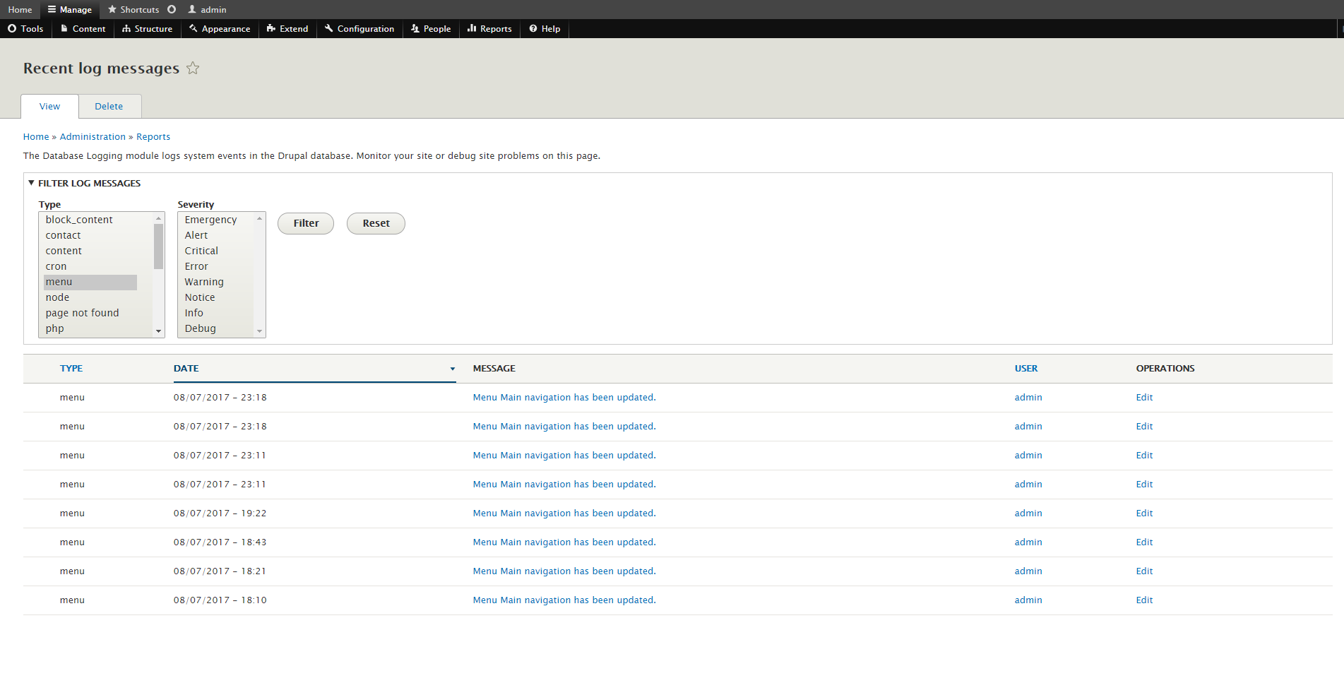 • Drupal 8 Admin Pages Drupal Log Messages Page