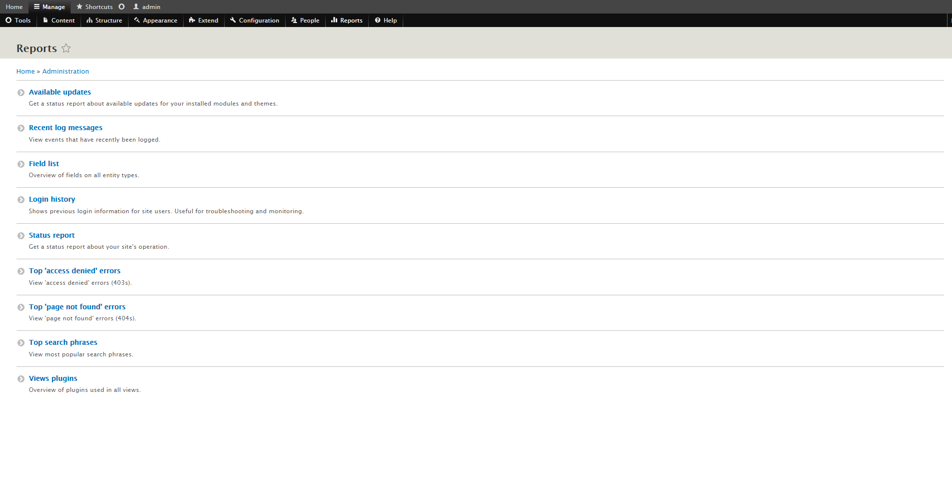 • Drupal 8 Admin Pages Reports List Page
