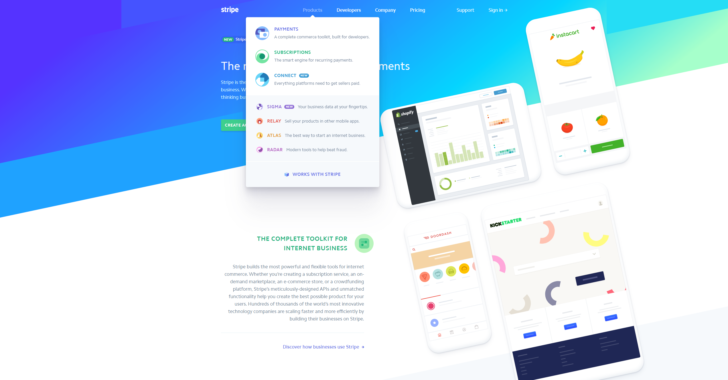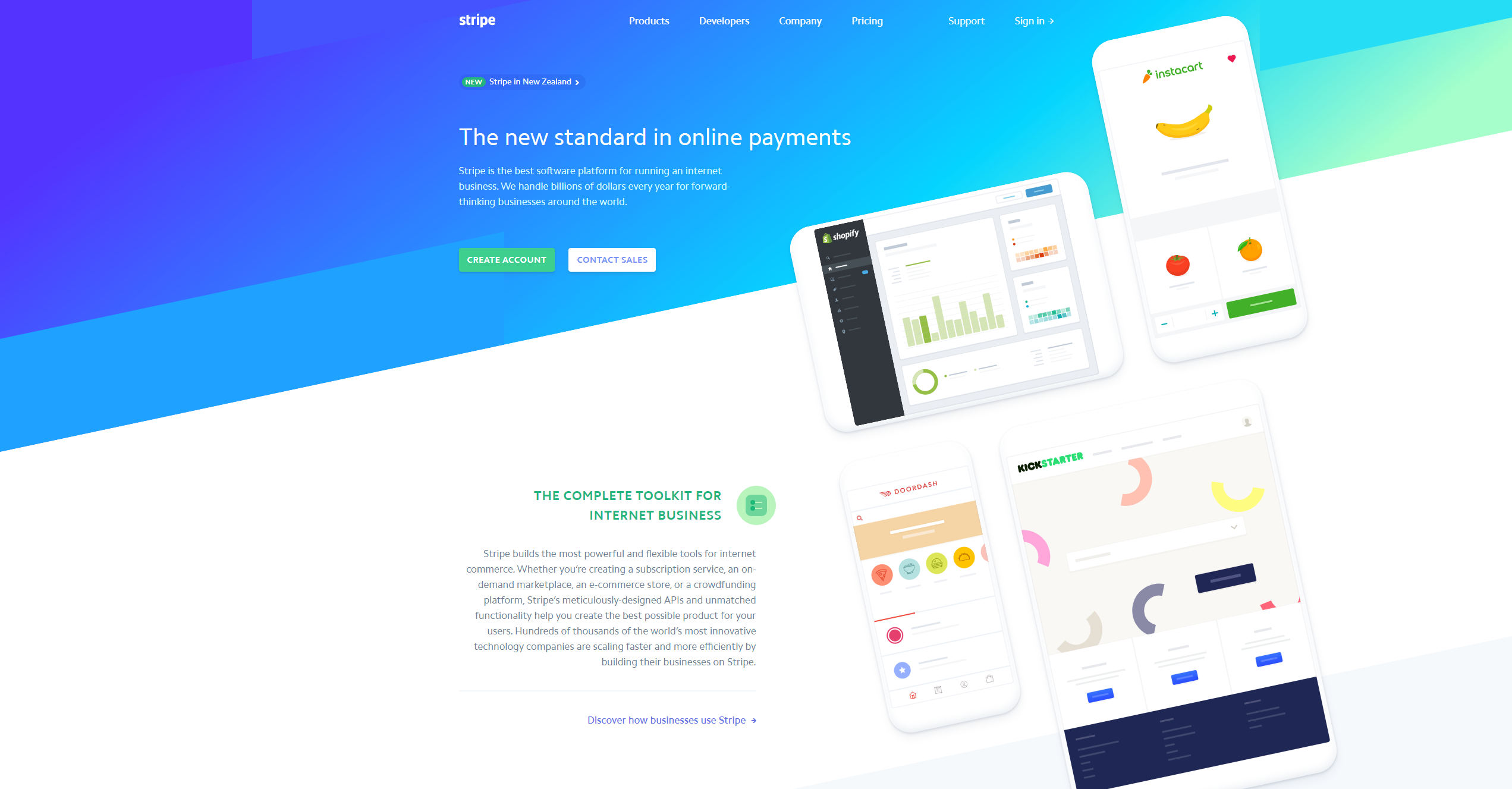 The www.stripe.com website demonstrates numerous contemporary website features.