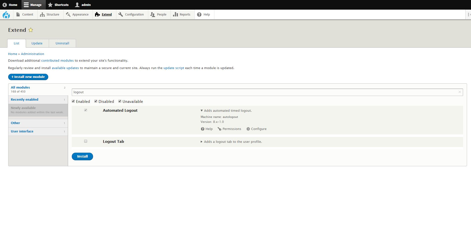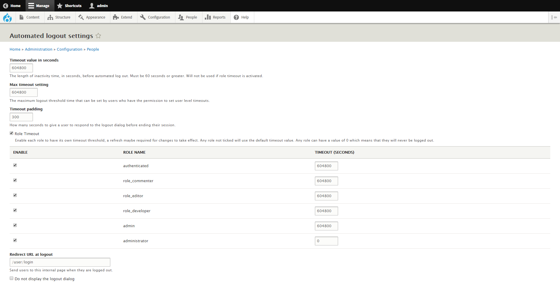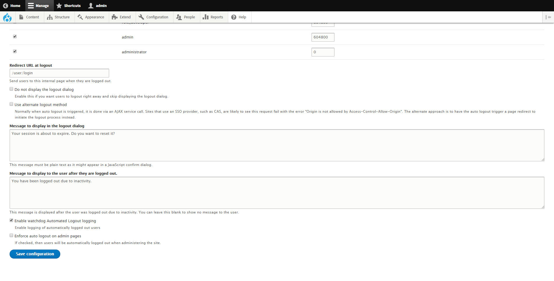 Once the module's code has been installed and the module has been enabled, the module can be configured via the website's administration page at the website's, located at the admin/config/people/autologout URL suffix.