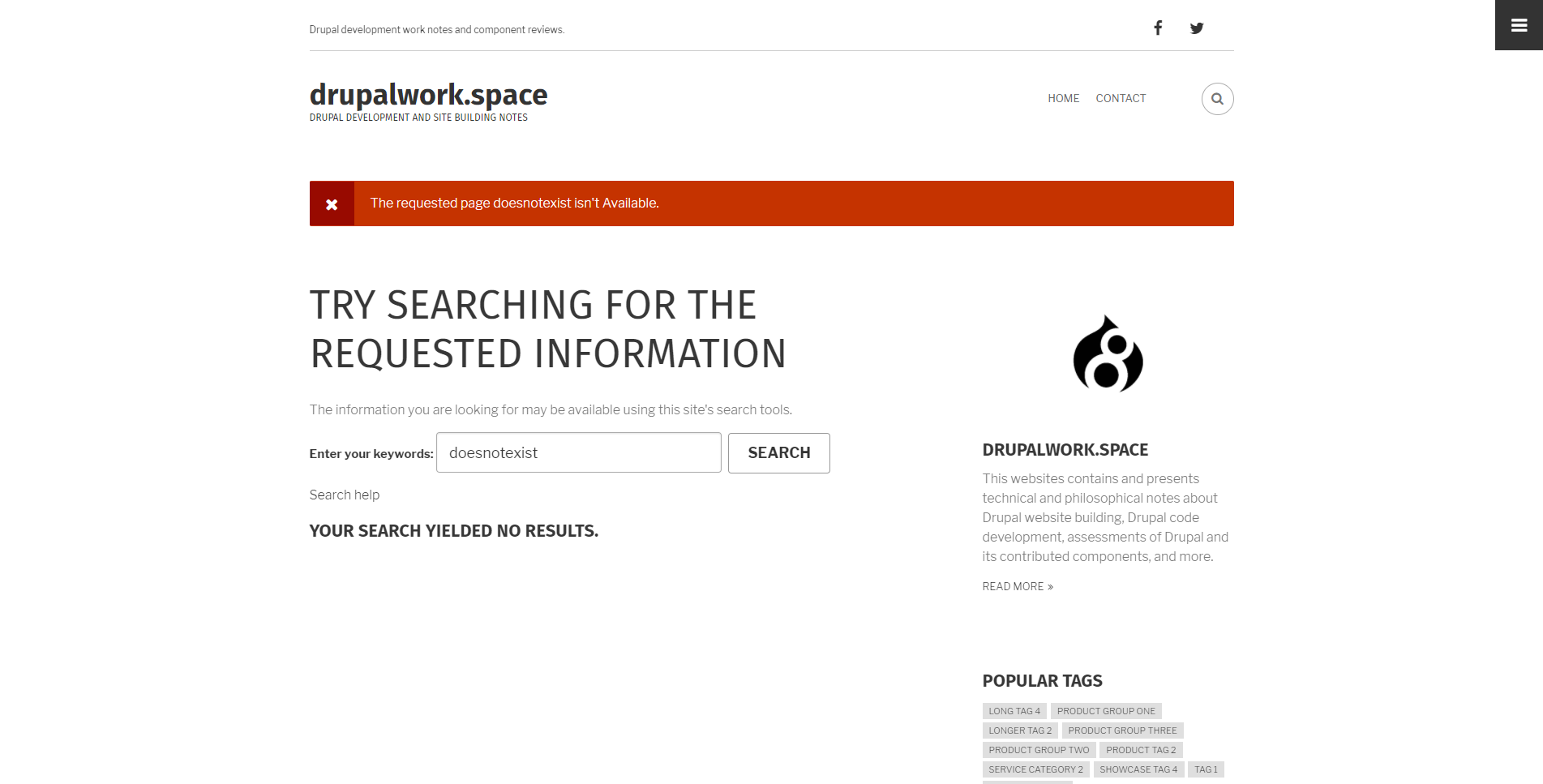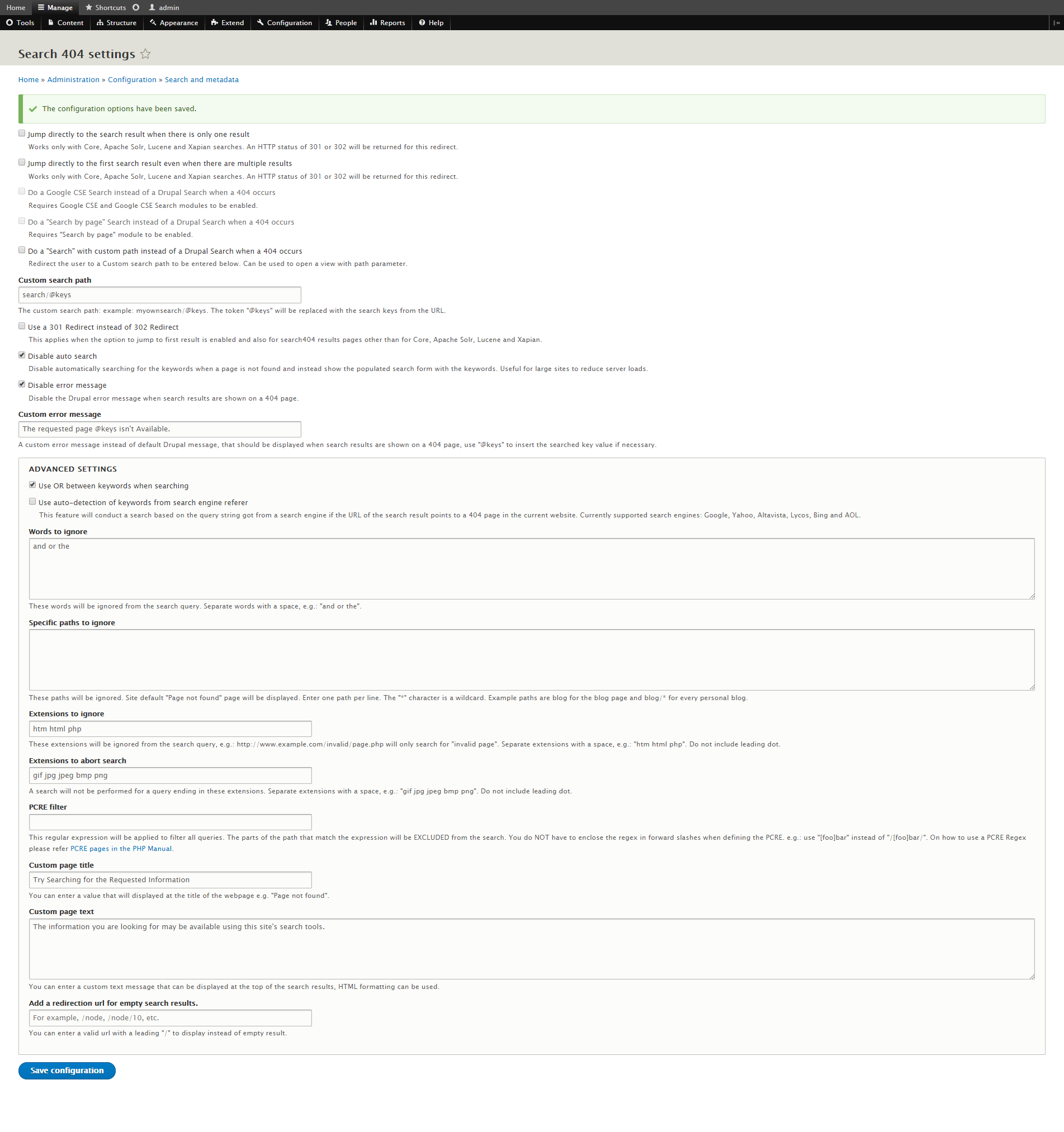 Next, enable the Search404 module at the site's admin/modules admin GUI page. Then customize the module's settings at the site's newly created admin GUI configuration page at the admin/config/search/search404 URL. The second image above shows one of various customization styles for the module. Lastly, test the module by entering a site URL that doesn't exist. If the module is working properly, the Drupal website search page will appear and display the custom settings entered via the module's configuration page.